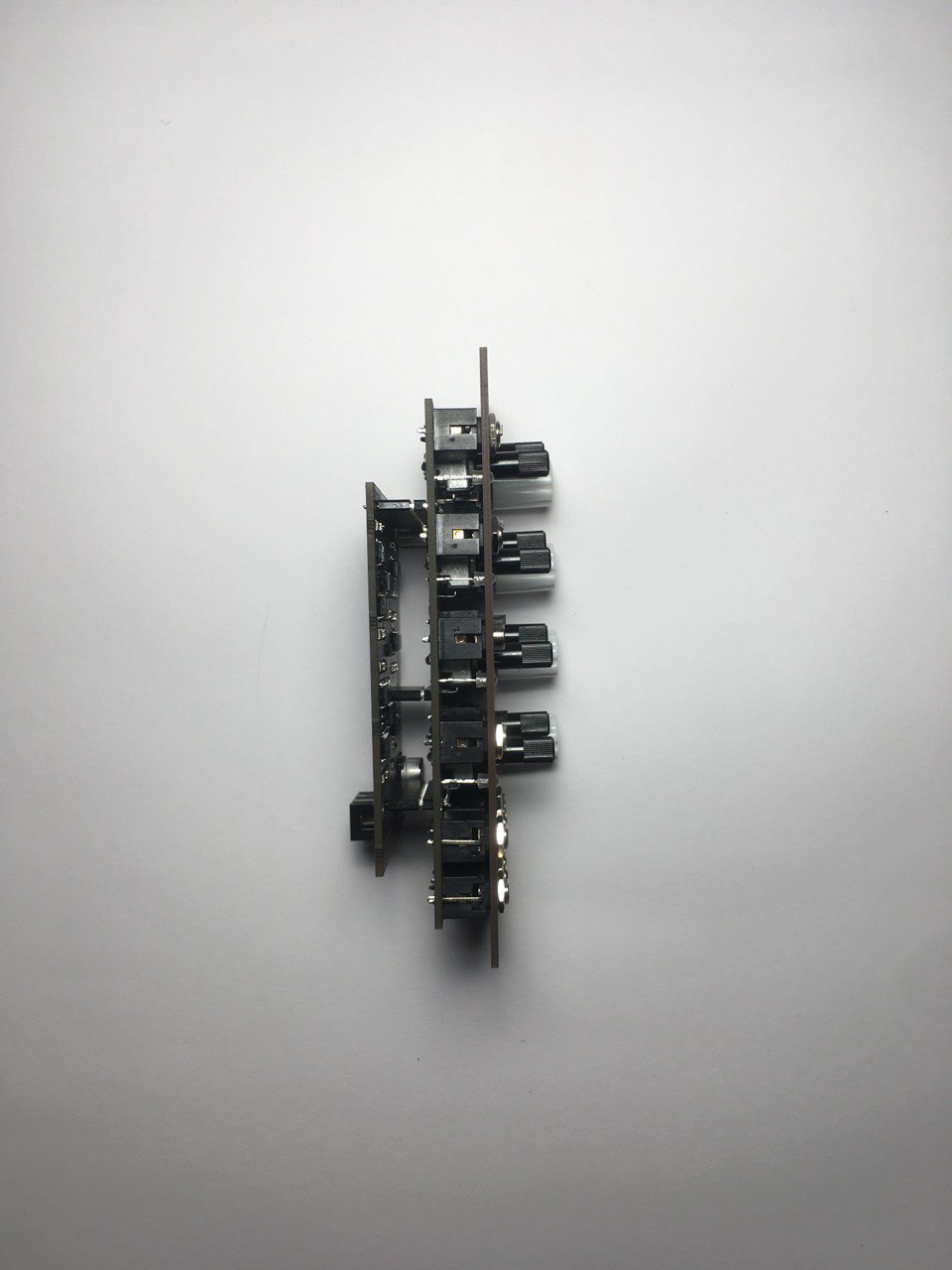 TetraVCA is a Quad Voltage Controlled Amplifier with an adjustable response curve from linear to exponential. The Control Voltage inputs all have an indvidual level control, a LED indicator and you can choose between attenuation or attenuvertion of the CV signal by flipping a switch. This allows you to amplitude modulate your signal in a more flexible way! Each channels CV’s are cascaded to the next as are the outputs. That lets you create submixes.